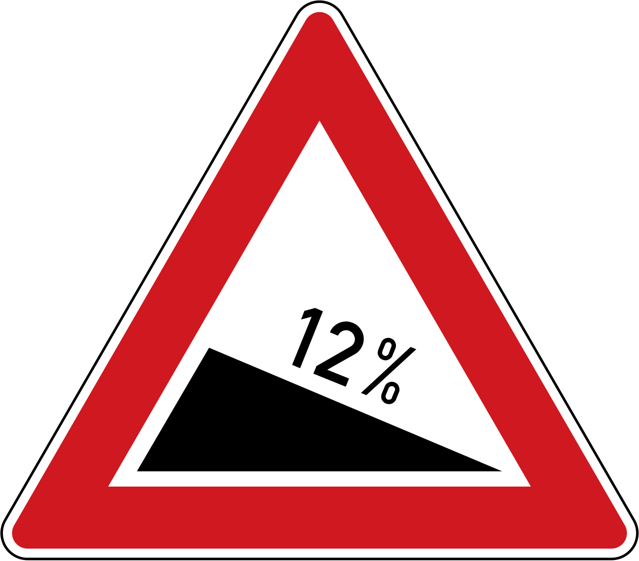 Знак попереджає про відрізок автомобільної дороги, де місцеві умови роблять спуск небезпечним. На знаку вказують фактичний найбільший поздовжній схил проїзної частини.